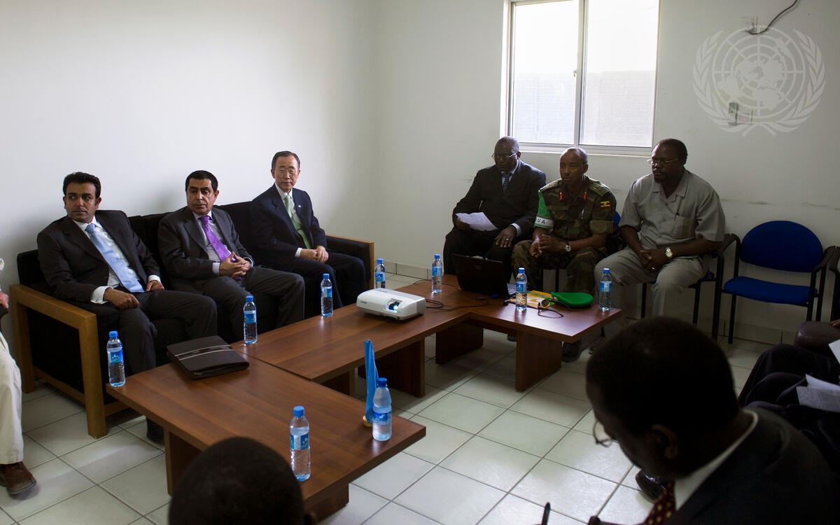 Secretary-General Ban Ki-moon (third from left) and General Assembly President Nassir Abdulaziz Al-Nasser (second from left) are briefed by General Fred Mushiga, Force Commander of the African Union Mission in Somalia (AMISOM), at the AMISOM facilities in Mogadishu.