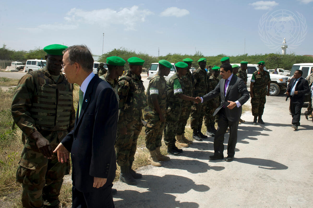 Secretary-General Ban Ki-moon and General Assembly President Nassir Abdulaziz Al-Nasser greet troops of the African Union’s UN-backed peacekeeping force, AMISOM, in Mogadishu, Somalia.