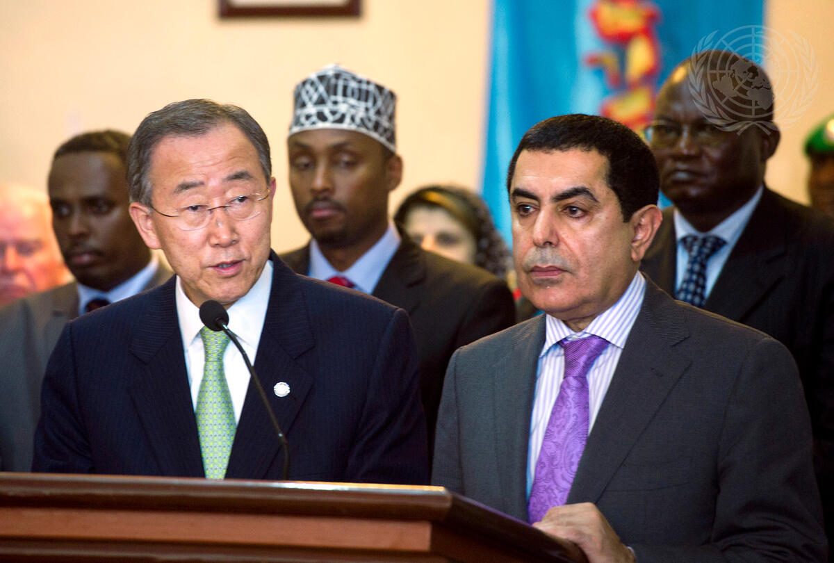 Secretary-General Ban Ki-moon (left) and Nassir Abdulaziz Al-Nasser, President of the sixty-sixth session of the General Assembly, brief reporters during a visit to Mogadishu, Somalia. It is the first-ever joint visit by a Secretary-General and General Assembly President to the conflict-torn nation, and the first by a Secretary-General in almost twenty years.