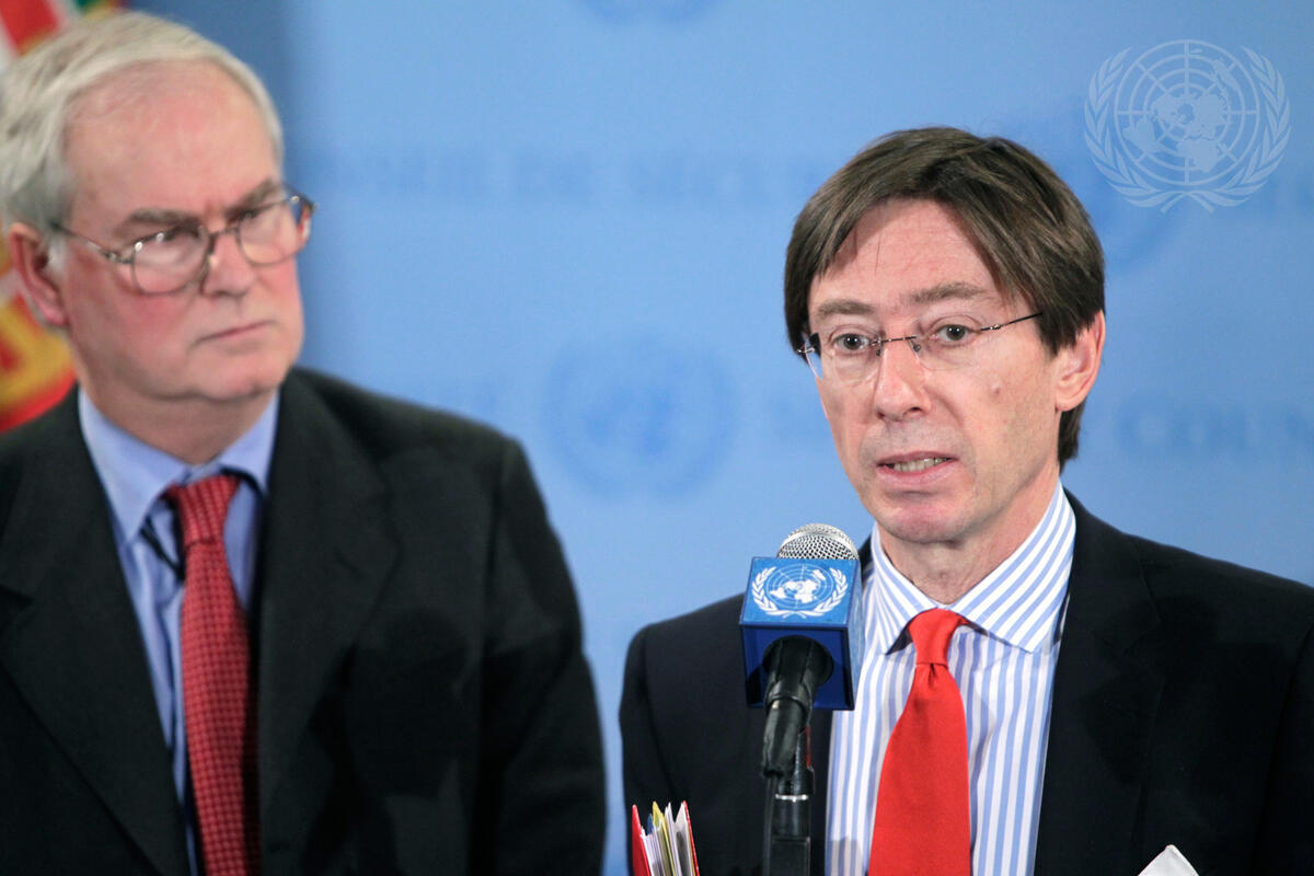 Peter Wittig, Permanent Representative of Germany to the UN, speaks to the press following a closed-door session of the Security Council on Syria, at which Members were briefed by UN High Commissioner for Human Rights Navi Pillay. Ms. Pillay urged the Council to refer Syria to the International Criminal Court for investigation into possible crimes against humanity. Pictured with Mr. Wittig is Mark Lyall Grant, Permanent Representative of the United Kingdom to the UN.