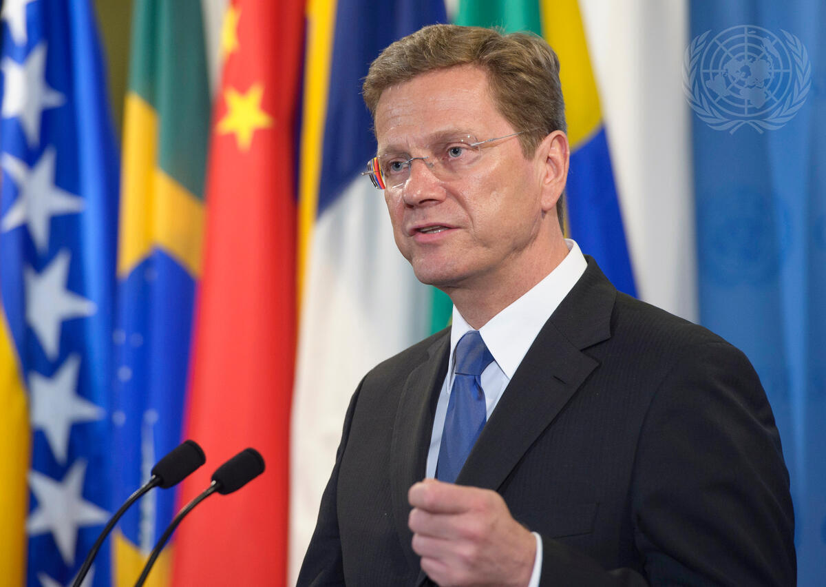 Guido Westerwelle, Minister for Foreign Affairs of Germany, speaks to journalists after chairing the Security Council meeting on children in armed conflict as President of the Security Council for July 2011.