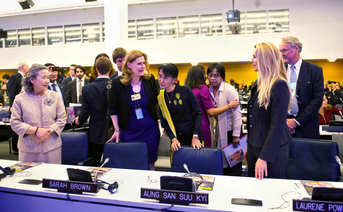 “Education First”, Secretary-General Ban Ki-moon’s Global Initiative on Education, which seeks to make a breakthrough to mobilize all partners to achieve universal primary education ahead of the 2015 target date for the Millennium Development Goals (MDGs), was launched on the margins of the UN General Assembly’s general debate. Myanmar parliamentarian Aung San Suu Kyi (centre right) was one of the participants in a panel discussion linked to the launch. She is seen lending an ear to Sarah Brown (centre left), wife of UN Special Envoy for Global Education Gordon Brown. At left is Yoo Soon-taek, the Secretary-General’s wife.