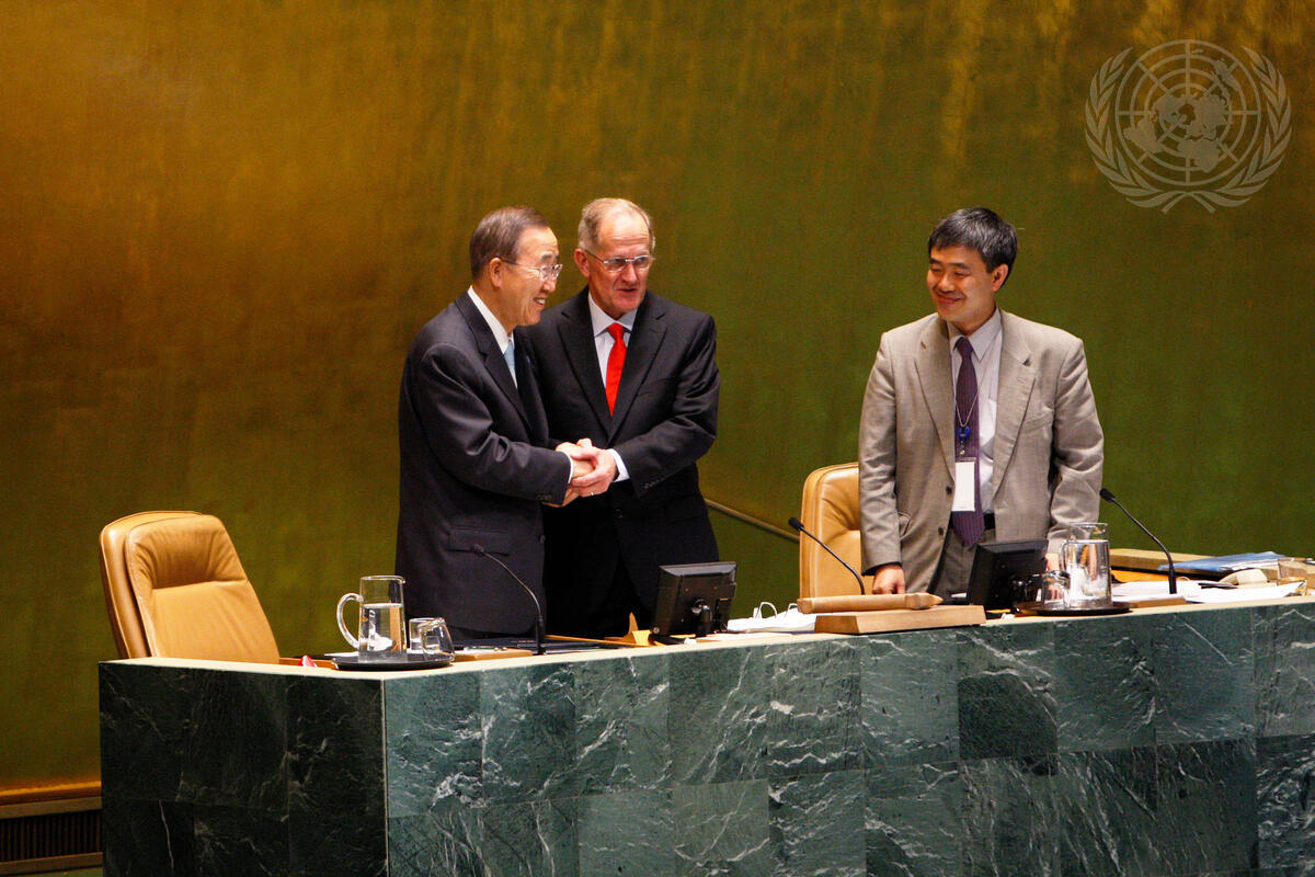 Secretary-General Ban Ki-moon and Joseph Deiss, President of the sixty-fifth session of the General Assembly, shake hands after the conclusion of the historic meeting of the General Assembly admitting the Republic of South Sudan as the 193rd Member State of the United Nations. Kenji Nakano, Senior Political Affairs Officer of the General Assembly Affairs Branch of the Department for General Assembly and Conference Management (DGACM) is on the right.