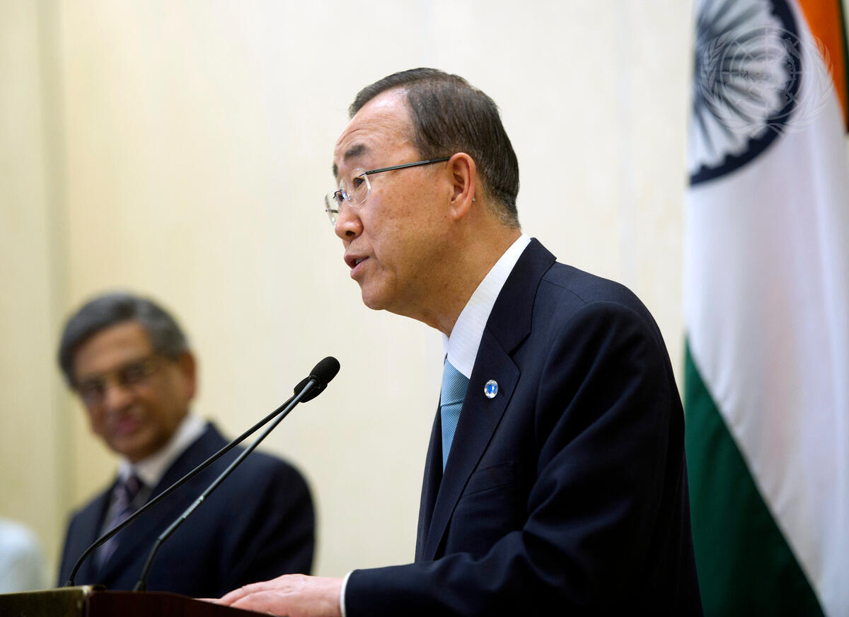Secretary-General Ban Ki-moon (right) and S. M. Krishna, Minister for External Affairs of India, brief the press before their tête-à-tête in New Delhi.