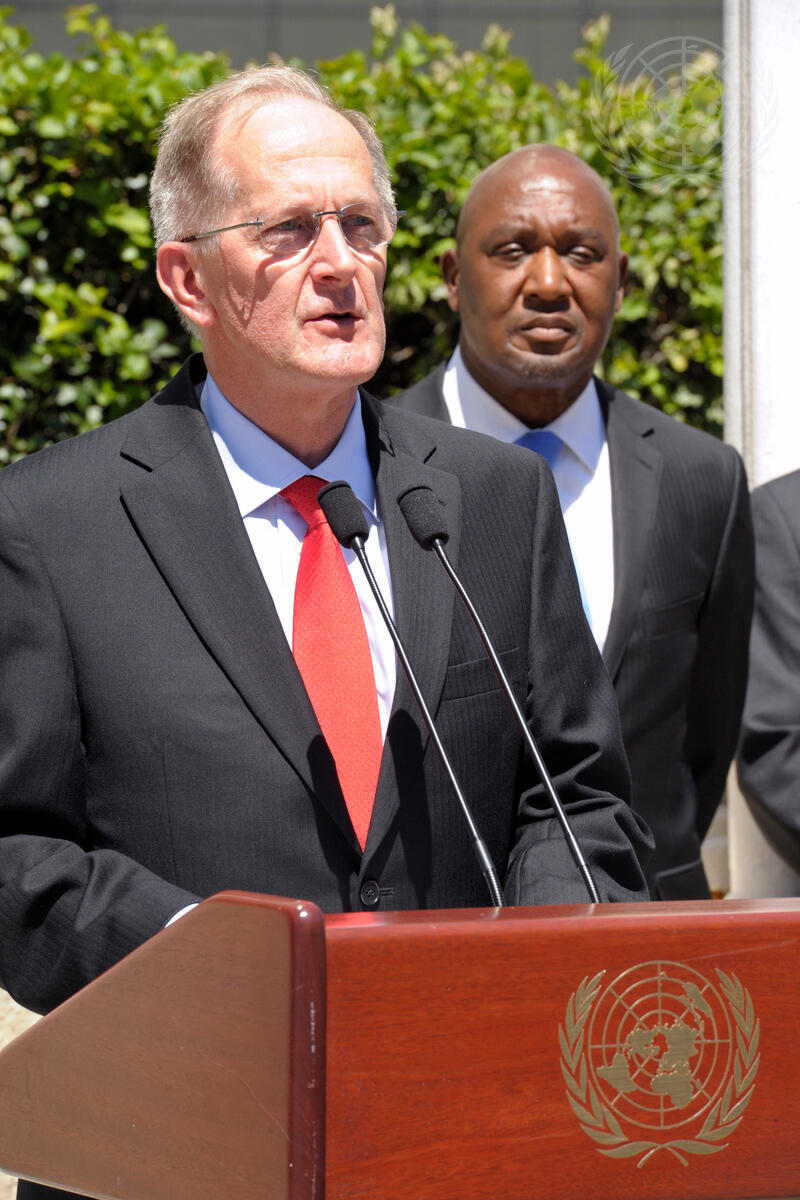 Joseph Deiss, President of the sixty-fifth session of the General Assembly, speaks at the Flag-Raising Ceremony, marking the admission of the Republic of South Sudan to the United Nations.