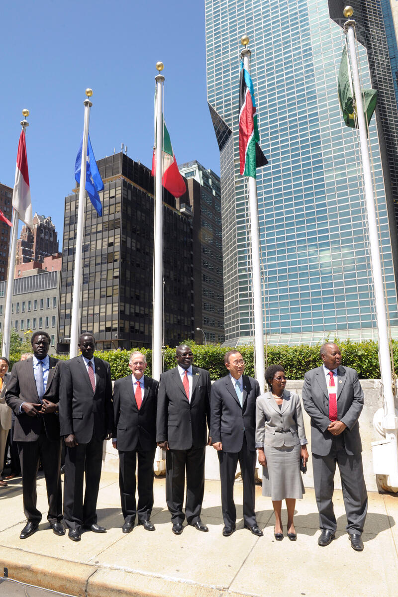 Group photograph taken after the national flag of the Republic of South Sudan is raised to mark the admission of the 193rd Member State to the community of nations. From second left to right: Deng Alor, Minister for Foreign Affairs of the Republic of South Sudan; Joseph Deiss, President of the sixty-fifth session of the General Assembly; Riek Machar Teny-Dhurgon, Vice President of the Republic of South Sudan; Secretary-General Ban Ki-moon; and Asha-Rose Migiro, Deputy Secretary-General of the United Nations.