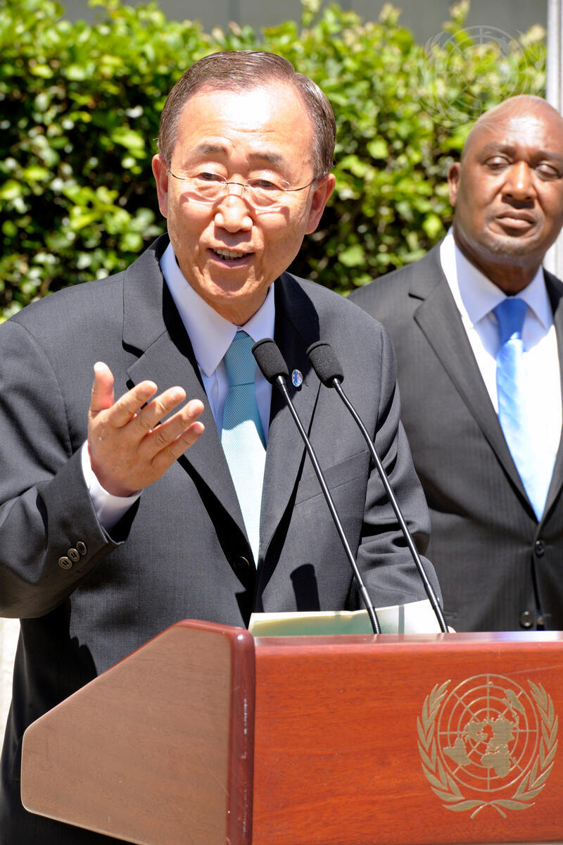 Secretary-General Ban Ki-moon, speaking at the flag-raising ceremony, welcomes the Republic of South Sudan to the community of nations.
