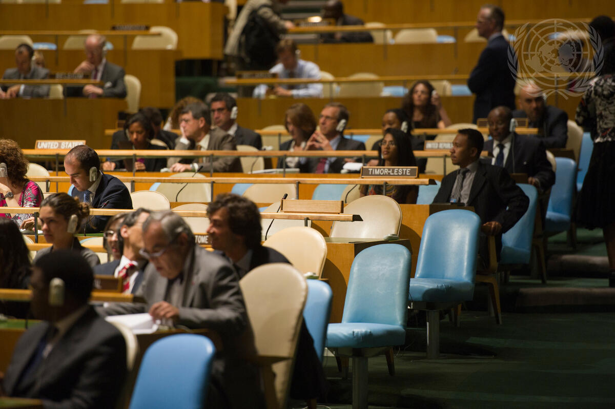A view of the delegation seats of the United States of America (USA) and Timor-Leste, photographed during the General Assembly meeting on the admission of the Republic of South Sudan to the United Nations. The USA is one of the original Member States of the UN. Timor-Leste is the 191st Member State, admitted to the community of nations on 27 September 2002.