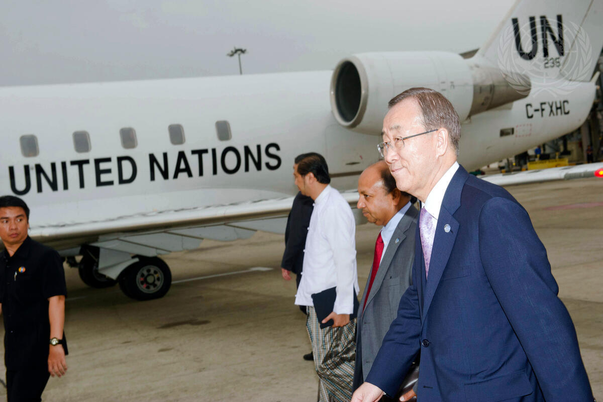 Secretary-General Ban Ki-moon (right) prepares to board his flight from Yangon to Naypyitaw, Myanmar.