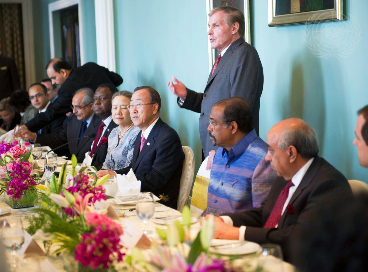 Also pictured: Ray Chambers (standing), Special Envoy of the Secretary-General for Malaria and for the Financing of the Health-related Millennium Development Goals, addressing the luncheon, and Michel Sidibé (seated right of Mr. Ban), Executive Director of the Joint United Nations Programme on HIV and AIDS (UNAIDS).