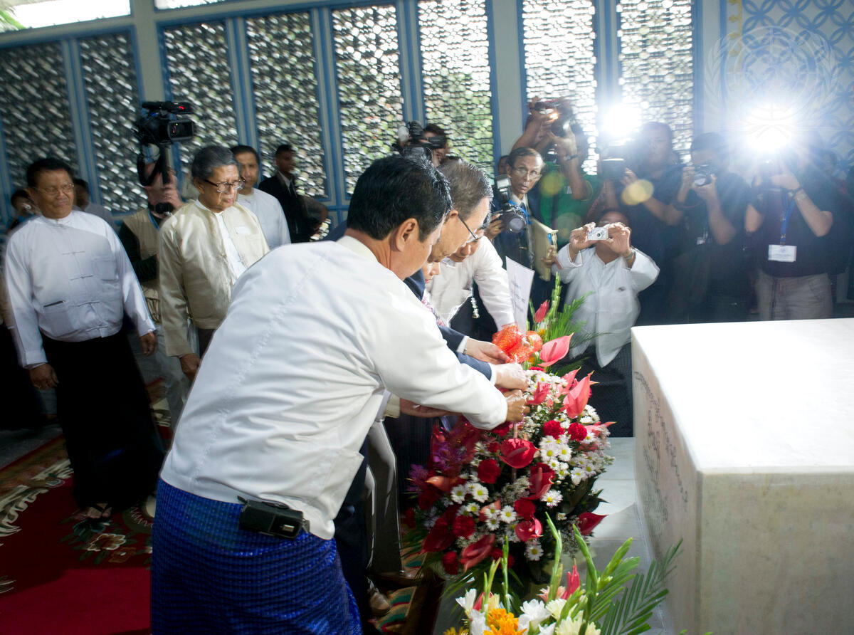 Secretary-General Ban Ki-moon (centre) and his wife, Yoo Soon-tael, lay a wreath at the memorial of the former UN Secretary-General and Myanmar national, U Thant, in Yangon.
