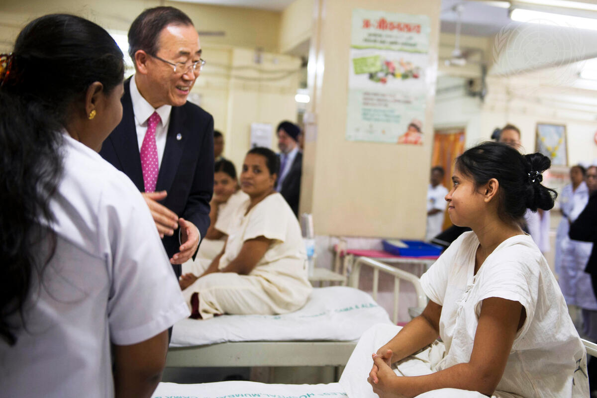 Secretary-General Ban Ki-moon speaks to a young mother as he tours the natal and maternal health wards at Cama Hospital in Mumbai, India.