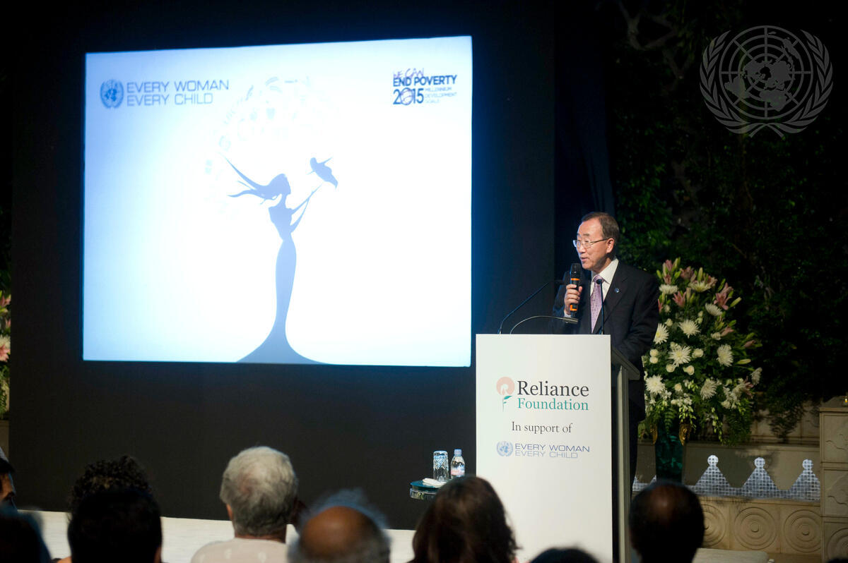 Secretary-General Ban Ki-moon addresses a reception on women’s and children’s health hosted by his Special Envoy for the Financing of the Health-related Millennium Development Goals (MDGs), Ray Chambers, and Mukesh Ambani, MDG Advocate, with the Bollywood creative community in Mumbai, India.