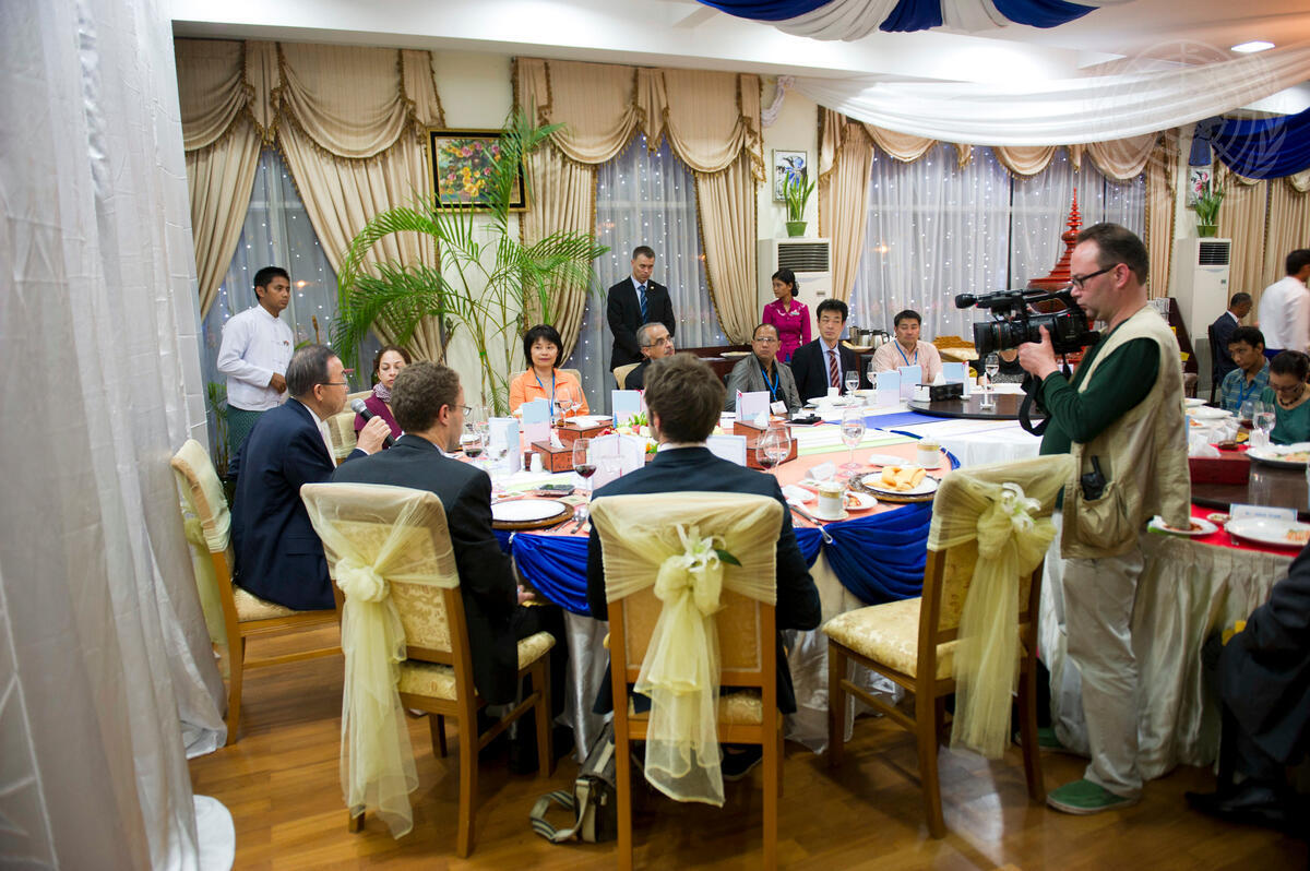 Secretary-General Ban Ki-moon (head of table, left) does a group interview with journalists during his official visit to Naypyitaw, Myanmar.