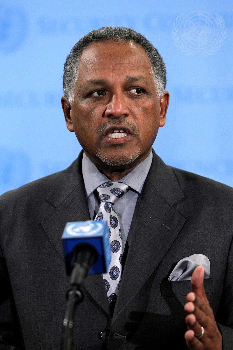 Daffa-Alla Elhag Ali Osman, Permanent Representative of Sudan to the UN, speaks to reporters following the Security Council’s closed-door consultations on the Darfur region of his country.