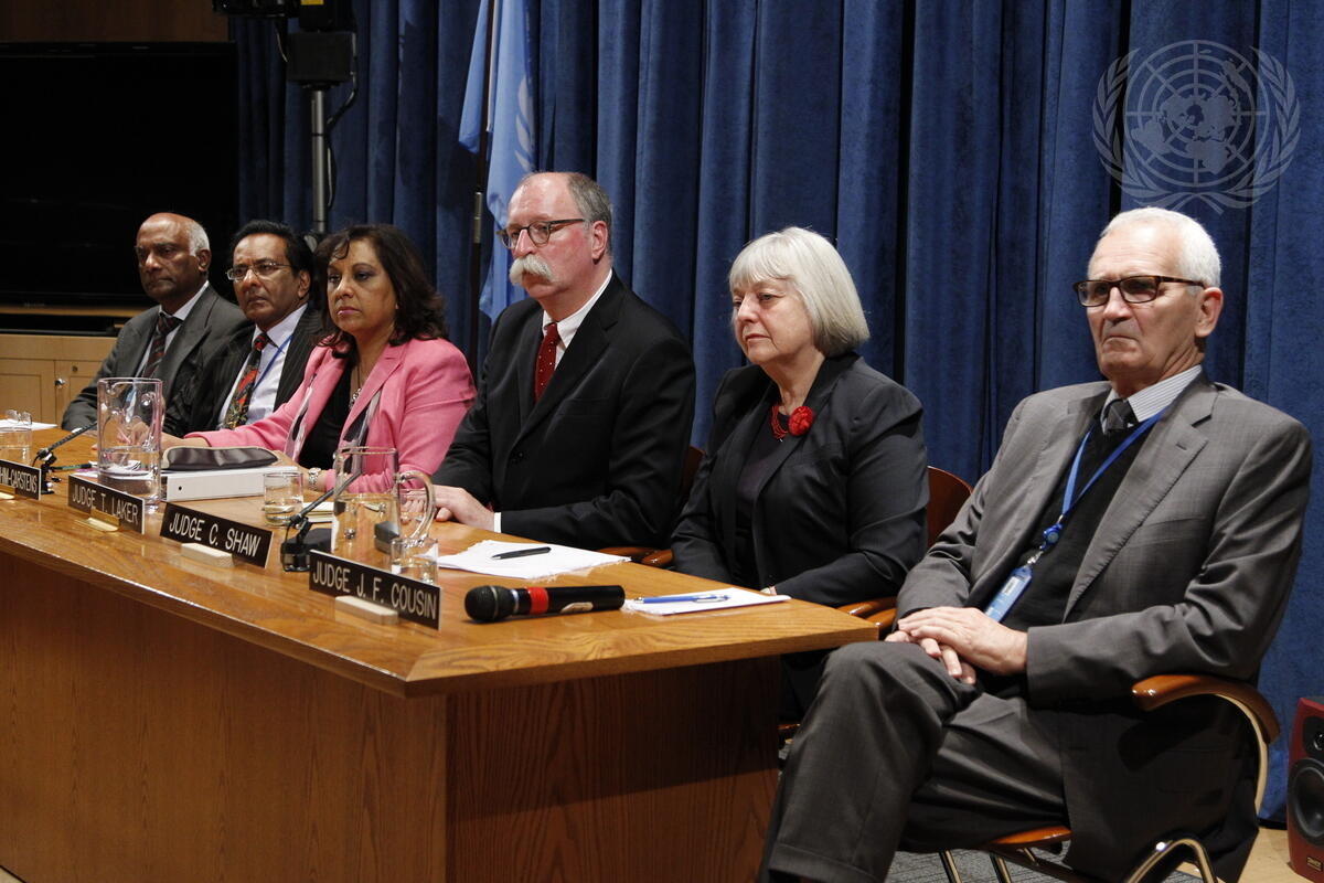 Judges from the UN Dispute Tribunal meet with a group of legal practitioners who regularly appear before the Tribunal. From left: Sir Goolam Hoosen Kader-Meeran (United Kingdom); Vinod Boolell (Mauritius); Memooda Ebrahim-Carstens (Botswana); Thomas Laker (Germany); Coral Shaw (New Zealand); and Jean-François Cousin (France).