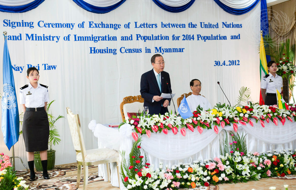 Secretary-General Ban Ki-moon speaks at a census event with Myanmar’s Vice-President, Sai Mauk Kham (seated right), in Naypyitaw.