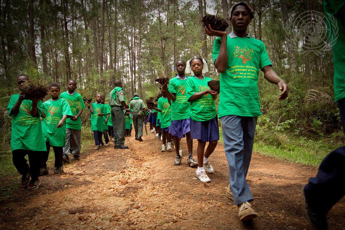 To commemorate International Environment Day (annually 5 June) hundreds of Haitian students take part in a massive tree-planting campaign at a pine forest, one of Haiti’s last, four hours drive from Port-au-Prince. The once-great forest has been depleted for charcoal production and to make room for farm land.