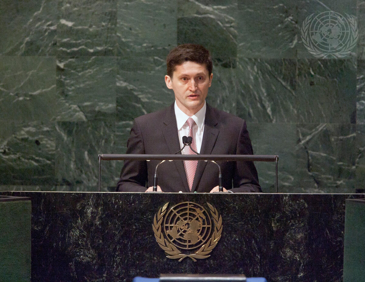Alexandru Cujba, Chair of the Group of Eastern European States and Permanent Representative of the Republic of Moldova to the UN, addresses the General Assembly following its re-appointment of Ban Ki-moon as UN Secretary-General. Mr. Ban will serve his second five-year term beginning 1 January 2012.