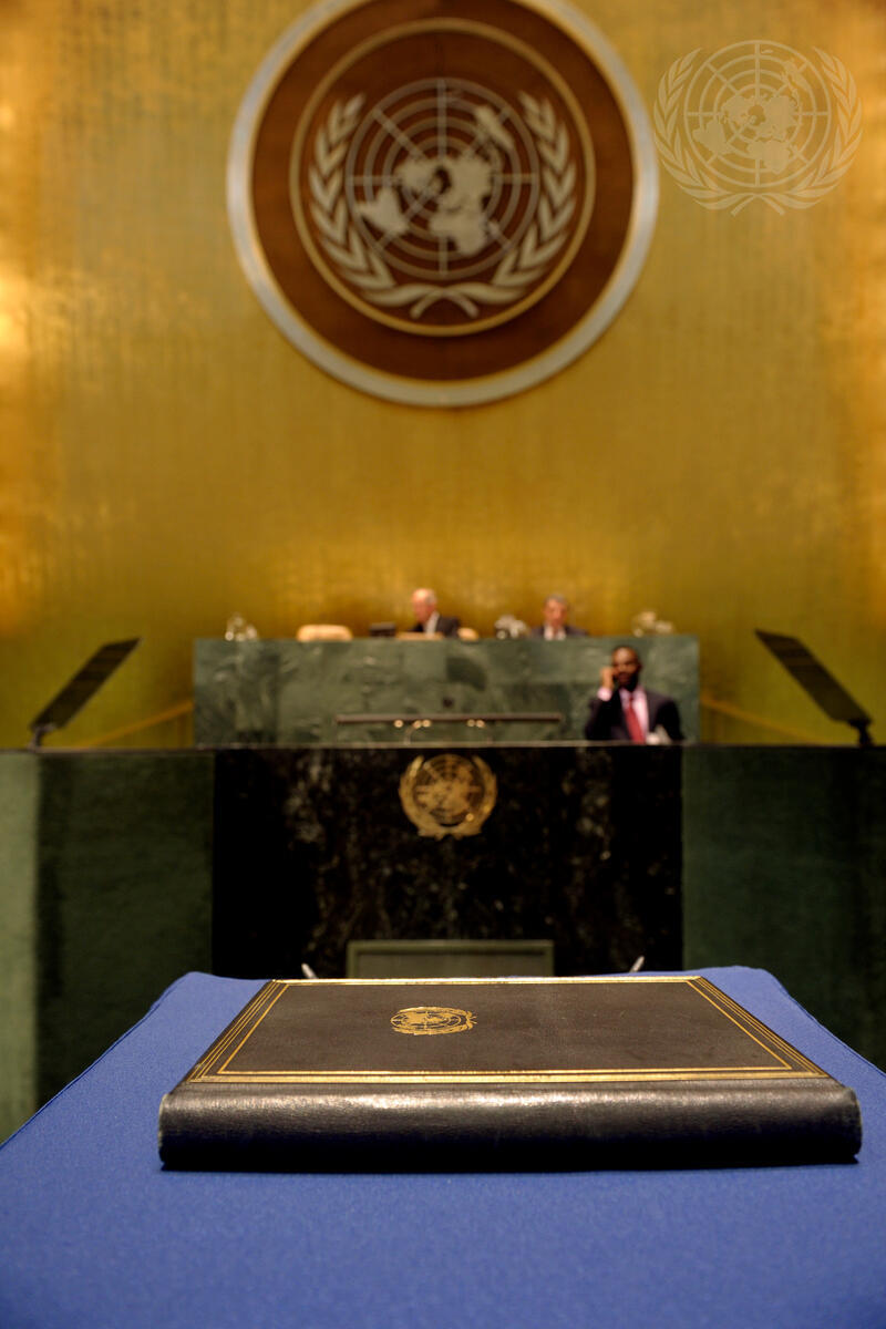 A close-up view of the the original United Nations Charter signed in San Francisco, on which Secretary-General Ban Ki-moon was sworn in, following his appointment by the General Assembly for a second term begininning in January 2012.
