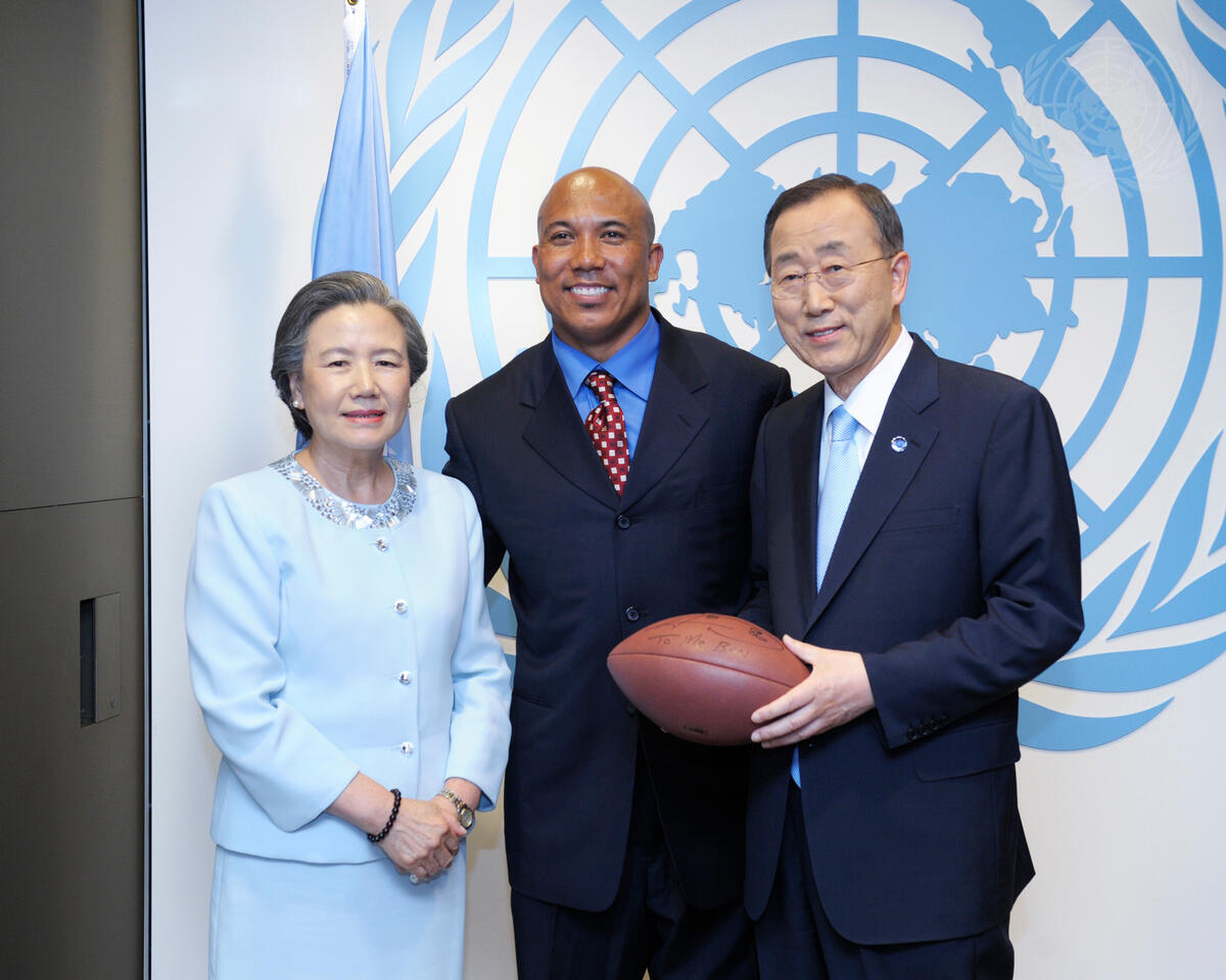 Ban Ki-moon (right) and his wife, Yoo Soon-taek, meet with NFL player Hines Ward after the General Assembly’s re-appointment of Mr. Ban as Secretary-General.