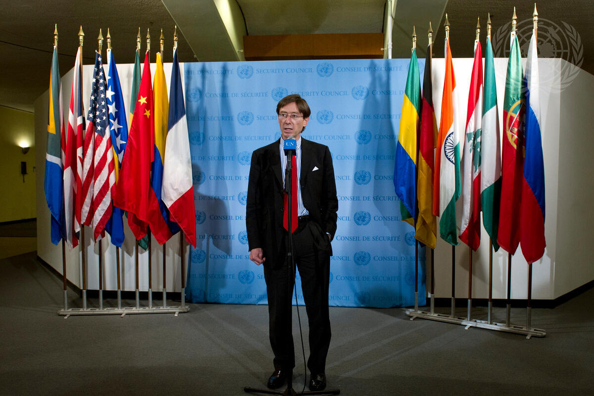 Peter Wittig, Permanent Representative of Germany to the UN, briefs correspondents following the Security Council’s decision to split the Taliban and Al-Qaida sanctions regime, recognizing that some members of the Taliban in Afghanistan had rejected the terrorist ideology of Al-Qaida and joined in the Government reconciliation process. Those Taliban still “constituting a threat to the peace, stability and security of Afghanistan” will be placed on a separate list.