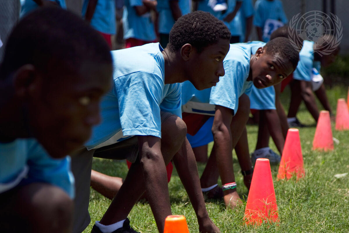 Students in Port-au-Prince, Haiti, prepare to take off in a symbolic “race against hunger” during a visit from U.S. athlete and Olympic gold medallist Carl Lewis. Mr. Lewis, a Goodwill Ambassador for the UN Food and Agriculture Organization (FAO), is supporting the initiatives “Fruit Trees for Haiti” and the International Year of Forests, as well as the Race Against Hunger campaign.