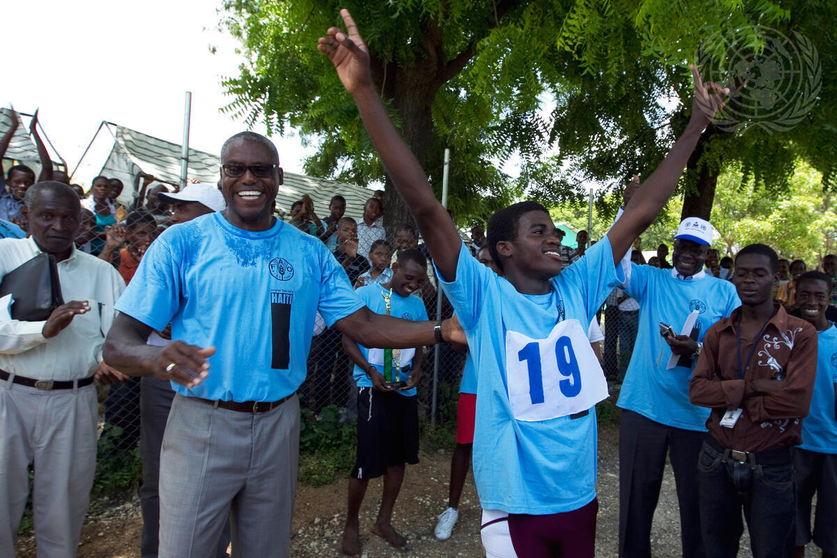 U.S. athlete and Olympic gold medallist Carl Lewis (second from left) congratulates the winner of a symbolic “race against hunger” between students from different schools, in Port-au-Prince, Haiti. Mr. Lewis, a Goodwill Ambassador for the UN Food and Agriculture Organization (FAO), is supporting the initiatives “Fruit Trees for Haiti” and the International Year of Forests, as well as the Race Against Hunger campaign.