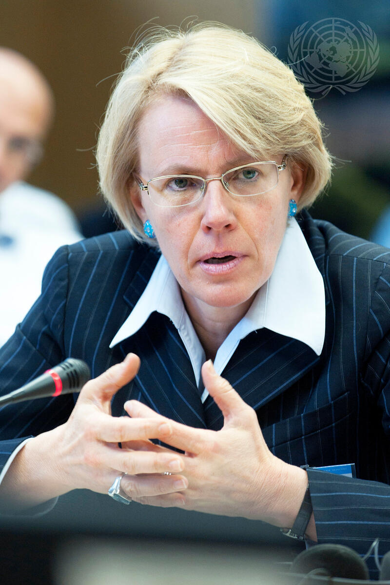 Corinne Momal-Vanian, Director of the United Nations Information Service (UNIS) in Geneva, speaks at a meeting of the UN Global Communications Group, in Geneva, Switzerland.