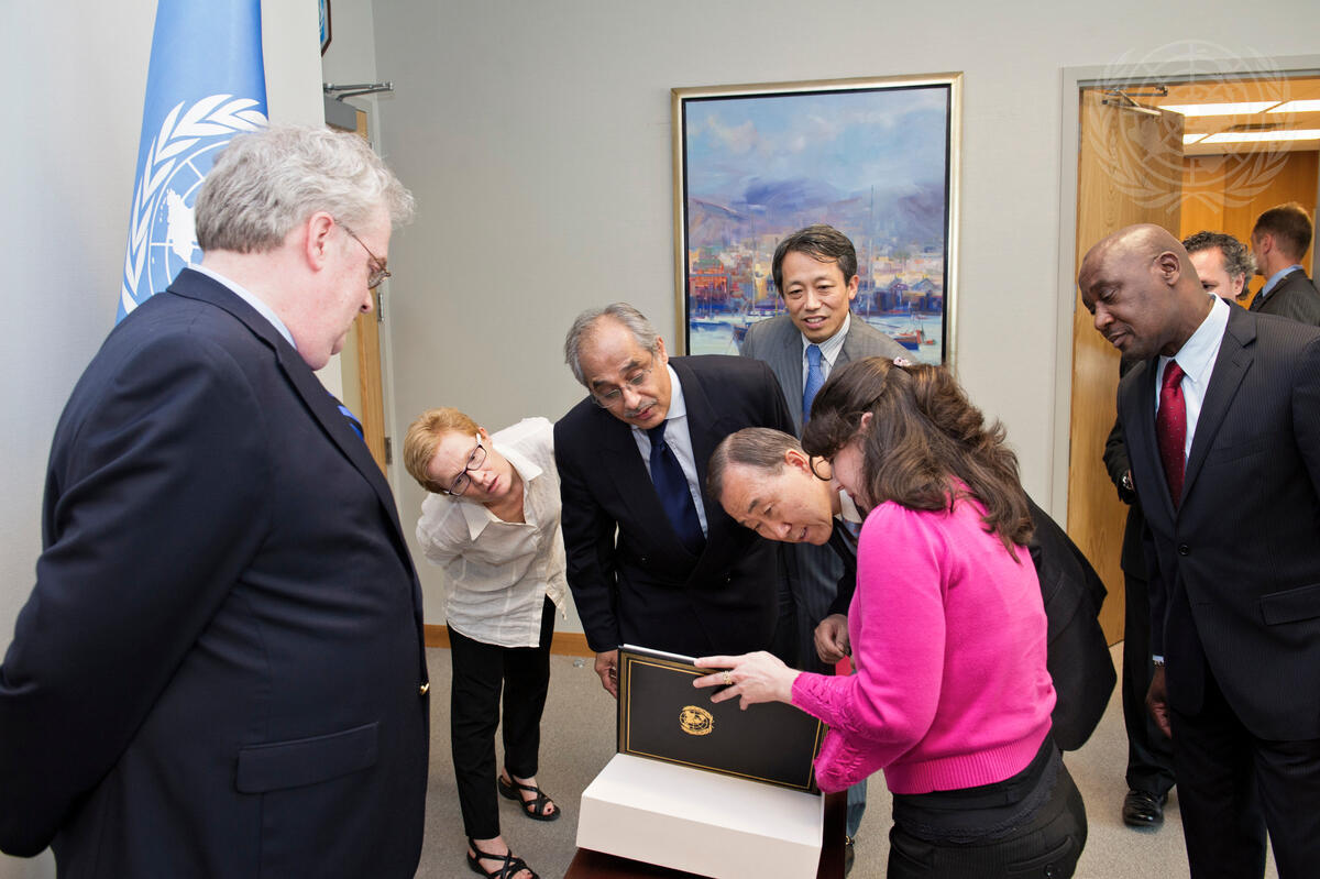 Secretary-General Ban Ki-moon (middle) views the original copy of the Charter of the United Nations, as Jana Dambrogio, United States National Archives Senior Conservator shows the document. From left to right: B. Lynn Pascoe, Under-Secretary-General for Political Affairs; Bridget Sisk, Chief of Archives and Records Management Section; Vijay Nambiar, Chef de Cabinet; Kim Won-soo, Deputy Chef de Cabinet and Special Adviser to the Secretary-General; and Desmond Parker, Chief of Protocol. The original founding document was brought from the United States National Archives in Washington D.C. to UN Headquarters for the second-term swearing-in ceremony of Secretary-General Ban Ki-moon.