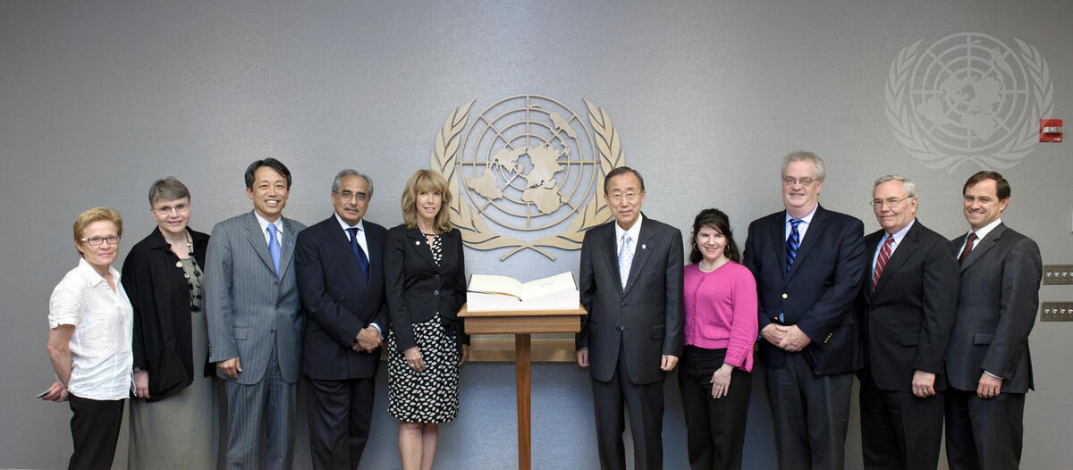 Secretary-General Ban Ki-moon (fifth from right) and senior UN officials pose for a group photo with the original UN Charter, brought from the National Archives in Washington, D.C., for Mr. Ban’s swearing-in ceremony to a second term as Secretary-General. With Mr. Ban: Kim Won-soo (third from left), his Deputy Chef de Cabinet; Vijay Nambiar (fourth from left), Chef de Cabinet; Patricia O’Brien (fifth from left), Under-Secretary-General for Legal Affairs; B. Lynn Pascoe (second from right), Under-Secretary-General for Political Affairs; Robert Orr (right), Assistant Secretary-General for Policy Coordination and Strategic Planning; Jana Dambrogio (fourth from right), Senior Conservator of the National Archives; and James Zeender (third from right), Senior Registrar of the National Archives.