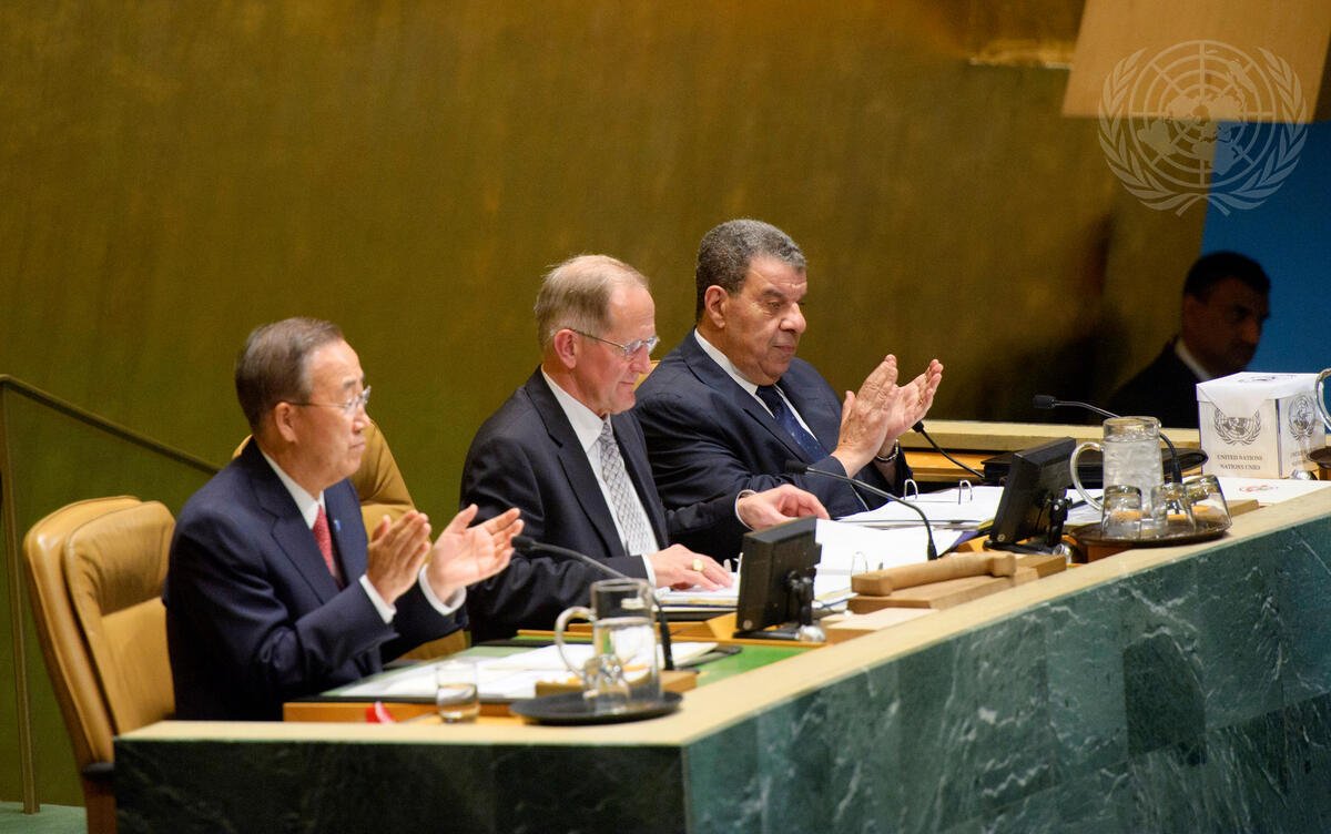 Secretary-General Ban Ki-moon (left) and Muhammad Shaaban (right), Under-Secretary-General for General Assembly Affairs and Conference Management, applaud as Joseph Deiss (centre), President of the sixty-fifth session of the General Assembly, announces the election by acclamation of Nassir Abdulaziz Al-Nasser, Permanent Representative of the State of Qatar to the UN, as President of the Assembly’s sixty-sixth session.