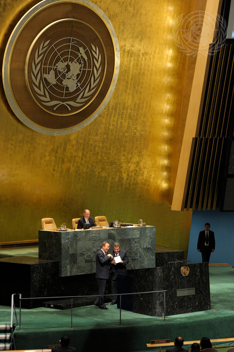 Secretary-General Ban Ki-moon (left) draws lots for the first seat of the seating order during the General Assembly’s sixty-sixth session. He picked the delegation of Turkmenistan. Beside him is Shaaban M. Shaaban, Under-Secretary-General for General Assembly and Conference Management.
