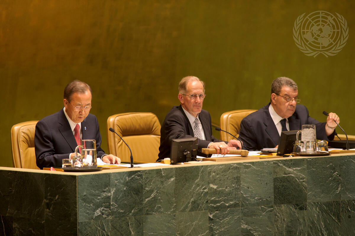 From left: Secretary-General Ban Ki-moon; Joseph Deiss, President of the sixty-fifth session of the General Assembly; and Muhammad Shaaban, Under-Secretary-General for General Assembly Affairs and Conference Management; officiate the proceedings during the election of Nassir Abdulaziz Al-Nasser, Permanent Representative of the State of Qatar to the UN, as President of the Assembly’s sixty-sixth session.
