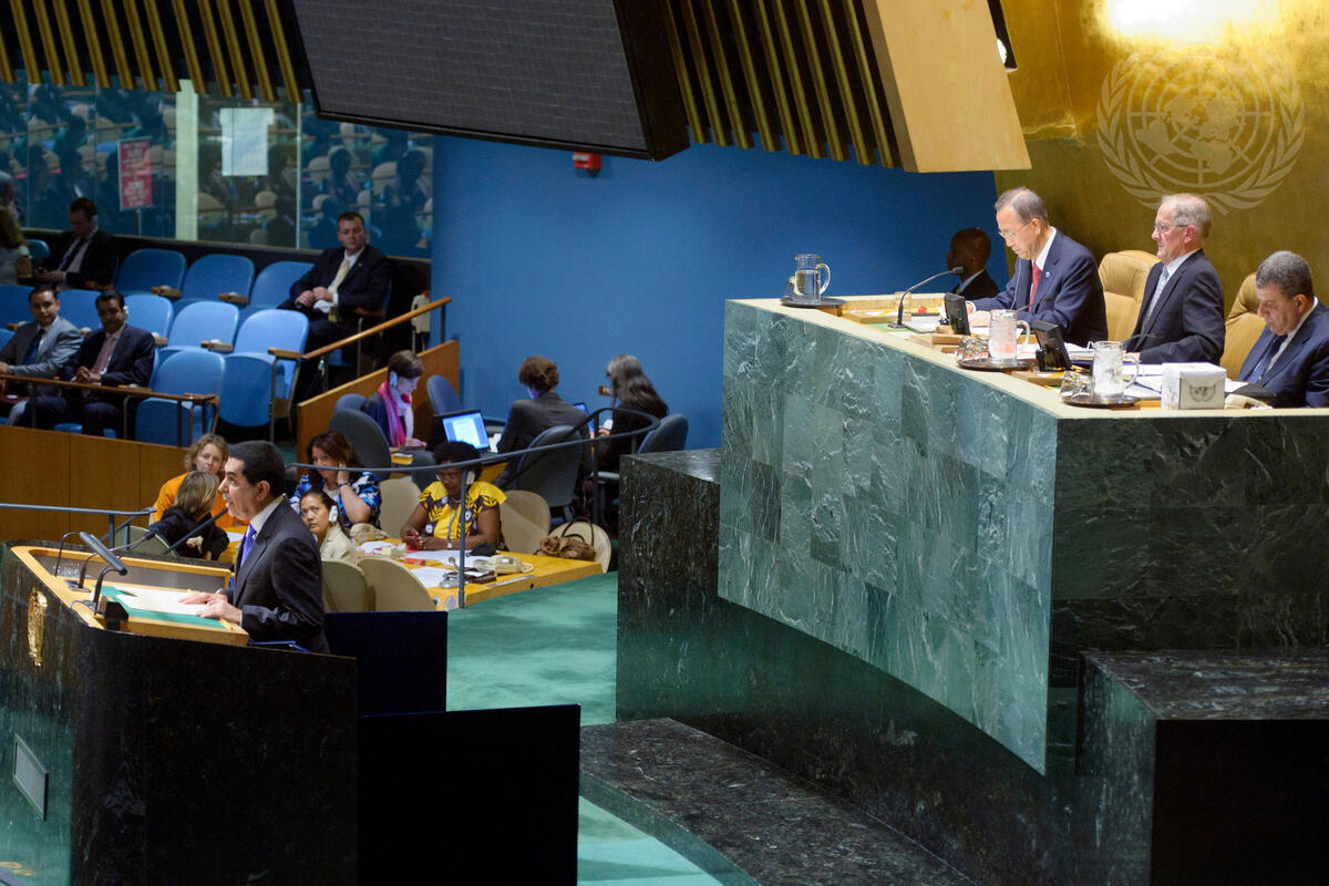 Nassir Abdulaziz Al-Nasser (at podium, front), Permanent Representative of the State of Qatar to the United Nations, addresses the General Assembly following his election as the President of the Assembly's sixty-sixth session. Seated behind him are, from left, Secretary-General Ban Ki-moon; Joseph Deiss, President of the sixty-fifth session of the Assembly; and Muhammad Shaaban, Under-Secretary-General for General Assembly Affairs and Conference Management.