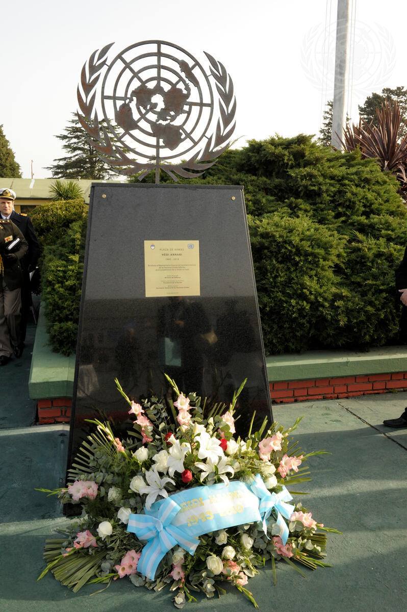 A wreath is laid at the monument to Hédi Annabi, the fallen chief of the UN’s peacekeeping mission in Haiti (MINUSTAH), at the Joint Training Center for Peacekeeping Operations, near Buenos Aires, Argentina. The monument was unveiled during a visit by Secretary-General Ban Ki-moon.