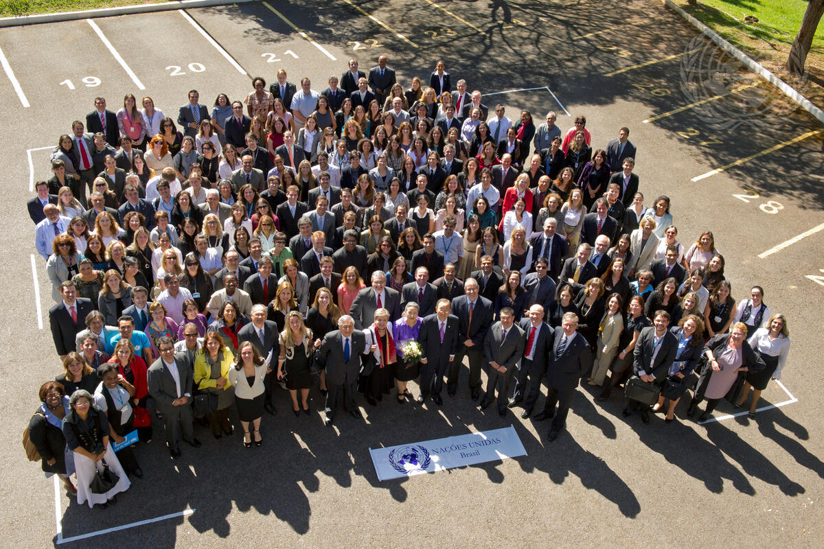 An aerial view of Secretary-General Ban Ki-moon (first row, fifth from right) and UN staff members based in Brazil, during Mr. Ban’s official visit to the county.