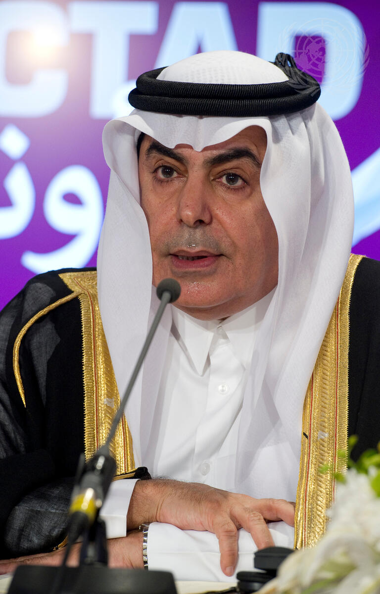 Nassir Abdulaziz Al-Nasser, President of the sixty-sixth session of the General Assembly, speaks at a press conference with the Secretary General of the UN Conference on Trade and Development (UNCTAD), Supachai Panitchpakdi, the day before the opening of the Conference’s 13th session (UNCTAD XIII) in Doha, Qatar.