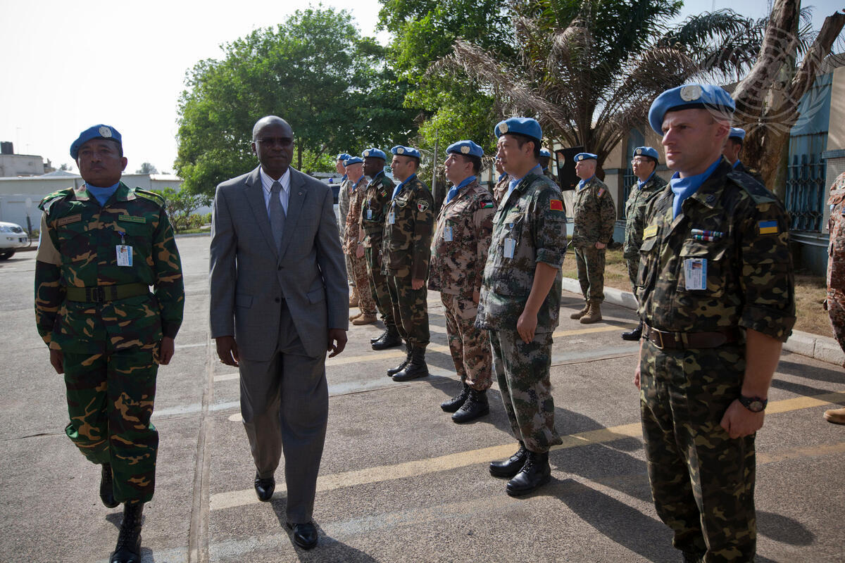 Moustapha Soumaré (left, facing camera), Deputy Special Representative of the Secretary-General at the UN Mission in Liberia (UNMIL), reviews the Mission's peacekeeping troops before awarding them medals, during a ceremony in Monrovia.