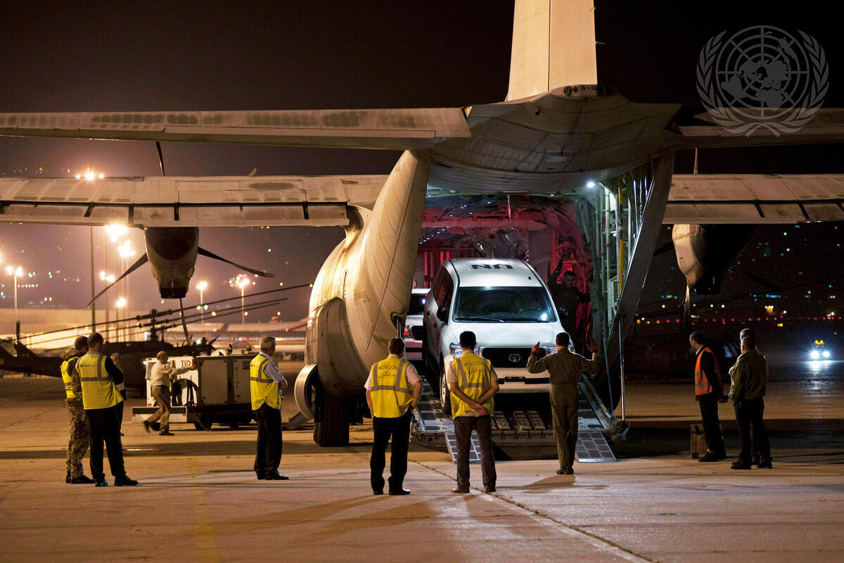 Armoured vehicles, designated for the newly-deployed UN team monitoring cessation of violence in Syria, are unloaded from an Italian Air Force carrier in Beirut, Lebanon.