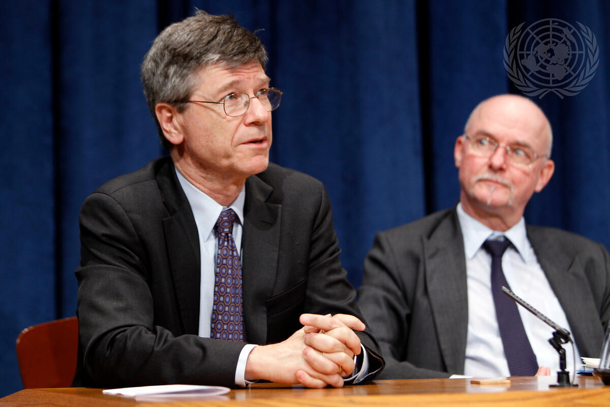 Jeffrey Sachs (left), the Secretary-General’s Special Adviser on the Millennium Development Goals (MDGs), and Thomas Teuscher, Executive Director a.i. of the Roll Back Malaria Partnership, participate in a press conference ahead of 25 April’s World Malaria Day.