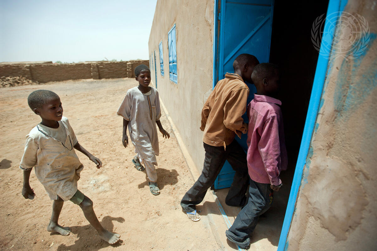Children at Abu Shouk camp for internally displaced persons (IDPs), North Darfur, enter one of the ten new classrooms built for the camp’s three primary schools. The Rwandan contingent of the African Union-UN Hybrid Operation in Darfur (UNAMID) built the classrooms as part of UNAMID’s ""Quick Impact Project"" (QIP) initiative.