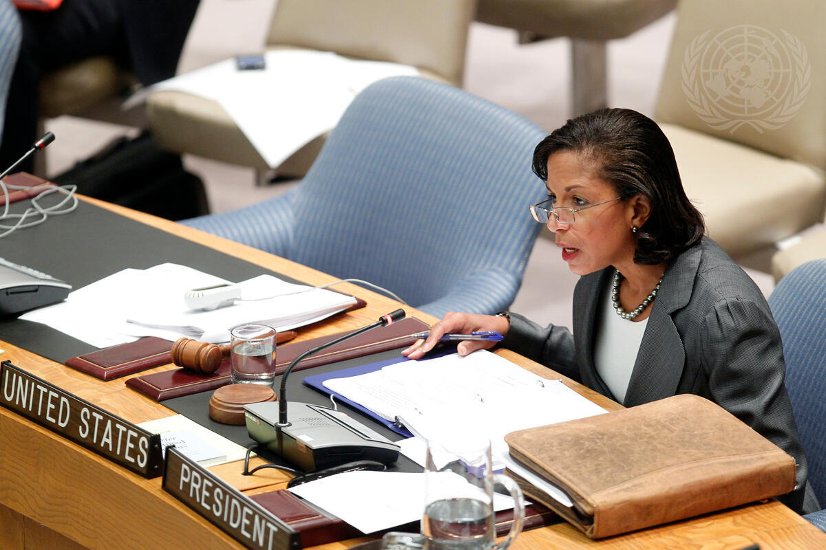 Susan Rice, Permanent Representative of the United States to the UN and President of the Security Council for April, chairs the Council’s meeting on illicit cross-border trafficking and movement.