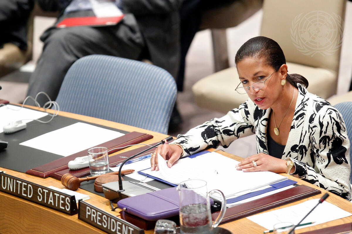 Susan Rice, Permanent Representative of the United States to the UN and President of the Security Council for April, speaks at the meeting of the Council at which Members unanimously adopted resolution 2043 (2012), authorizing the establishment of a 90-day UN supervision mission in Syria (known as UNSMIS).