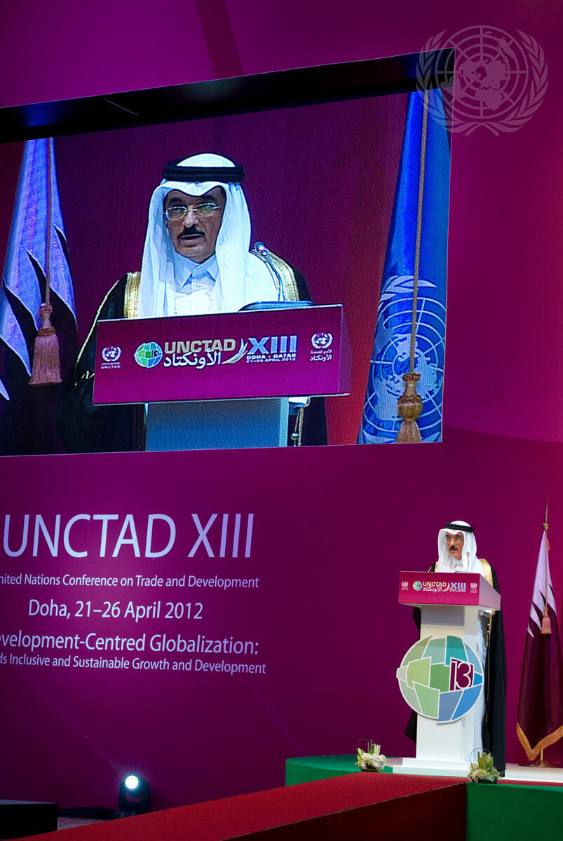 Hamad Bin Abdulaziz Bin Ali Al-Kuwari, Minister of Culture, Arts and Heritage of Qatar and President of the 13th session of the UN Conference on Trade and Development (UNCTAD XIII), speaks at the Conference’s opening ceremony in Doha.