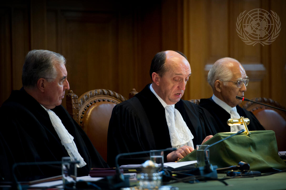 International Court of Justice (ICJ) President, Judge Peter Tomka (centre), at the opening of the ICJ hearings in the Nicaragua v. Colombia case.