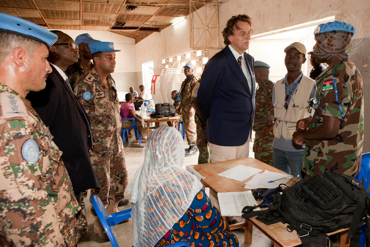 Head of the UN Operation in Côte d'Ivoire (UNOCI), Bert Koenders (centre, in blue jacket), visits the medical care centre during UNOCI’s series of outreach activities with local communities, known as ""Journées ONU"" (or UN Days), in the town of Bonoua.