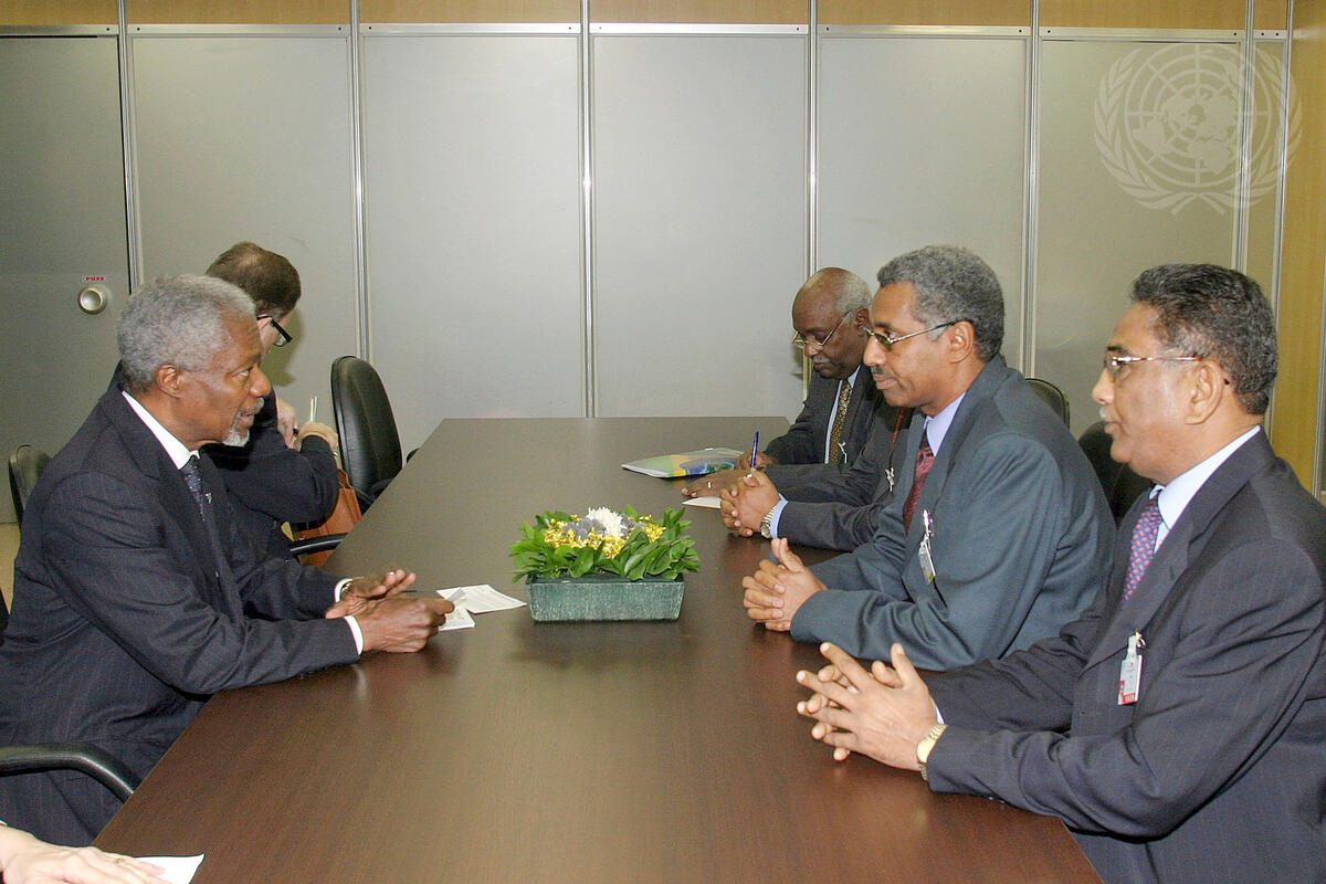 Secretary-General Kofi Annan (left) meets with Hassam Ahmed Taha (second from right foreground), Finance Minister of Sudan.