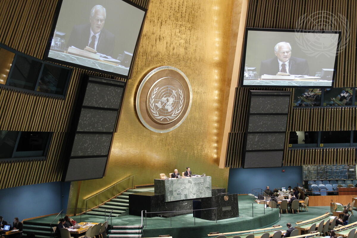 A wide view of the General Assembly as Martin Sajdik (on screen), Permanent Representative of Austria to the UN and Vice-President of the Assembly, chairs a meeting on the global road safety crisis. By the adoption of a consensus resolution, the Assembly welcomed the national and local launches of the Decade of Action for Road Safety 2011-2020, as well as other global events designed to stem the “staggering” number of preventable casualties on the roads.