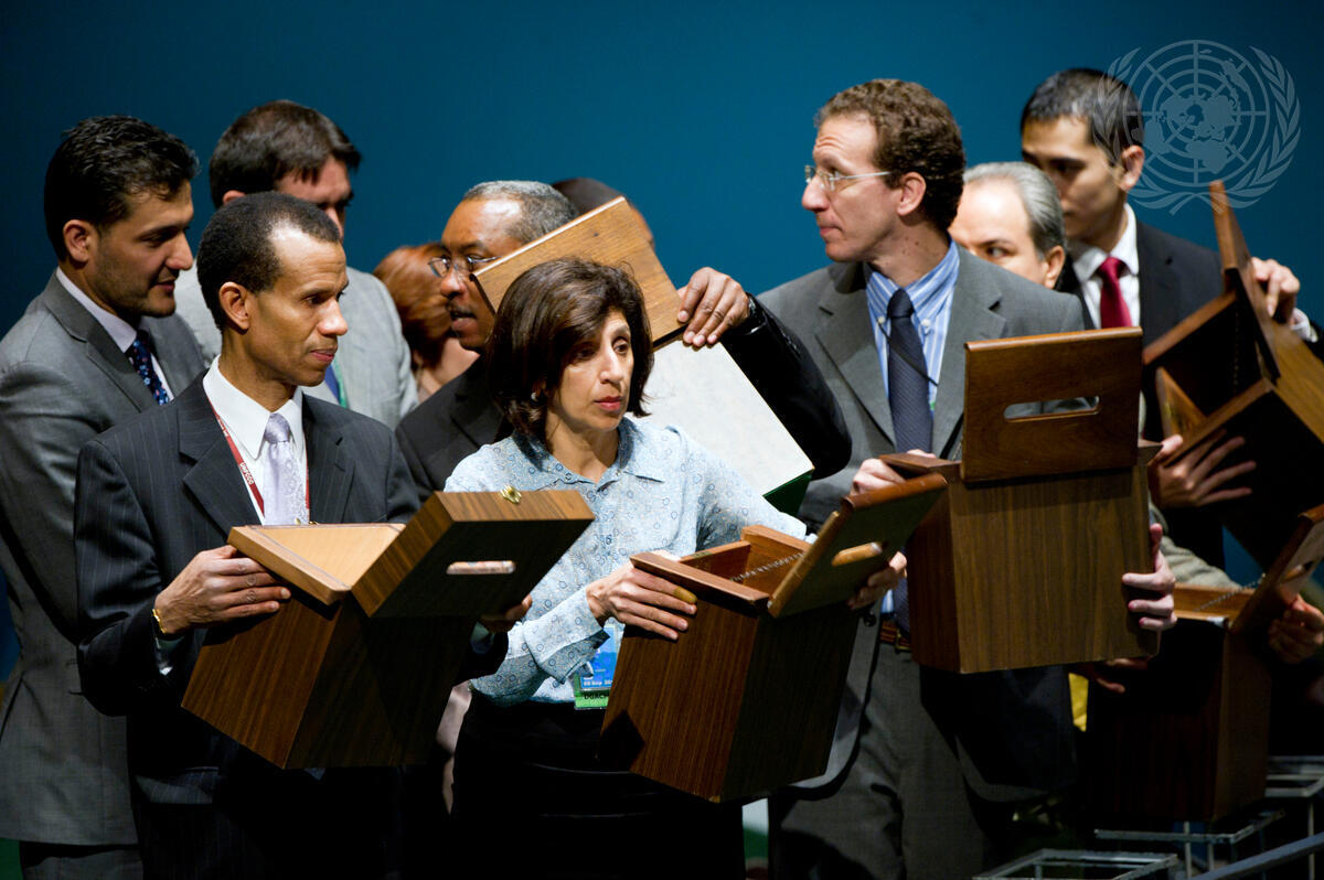 Conference Service support staff hold up empty ballot boxes before circulating them among Members of the General Assembly, who will vote to fill three vacancies on the United Nations Dispute Tribunal.